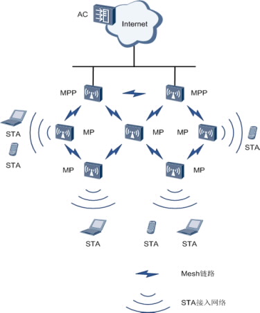 在上述組網(wǎng)中,作為Mesh節(jié)點(diǎn)MP(Mesh Point)的AP通過網(wǎng)狀互聯(lián)形成自配置、自愈合的無線Mesh網(wǎng)絡(luò)WMN(wireless mesh network)主干,通過作為Mesh Portal節(jié)點(diǎn)MPP(Mesh Portal Point)的帶網(wǎng)關(guān)功能的AP提供到Internet的連接。終端節(jié)點(diǎn)可以通過AP的接入服務(wù)來接入WMN網(wǎng)絡(luò)中。由于存在專用的Mesh路由協(xié)議,其傳輸質(zhì)量能夠得到較好的保障,更適用于需要高帶寬、高穩(wěn)定性的Internet連接的場景。
