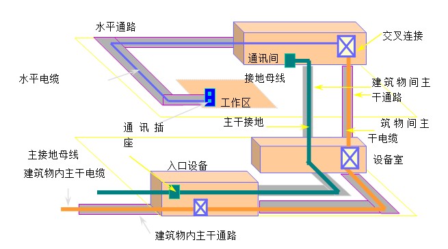 設(shè)備間子系統(tǒng)由設(shè)備間中的電纜、連接器和有關(guān)的支撐硬件組成。它的作用是把公共系統(tǒng)設(shè)備的各種不同設(shè)備互連起來。該子系統(tǒng)將中繼線交叉連接處和布線交叉連接處與公共系統(tǒng)設(shè)備連接起來。該子系統(tǒng)還包括設(shè)備間和鄰近單元如建筑物的入口區(qū)中的導(dǎo)線。這些導(dǎo)線將設(shè)備或避雷裝置連接到有效建筑物接地點。
